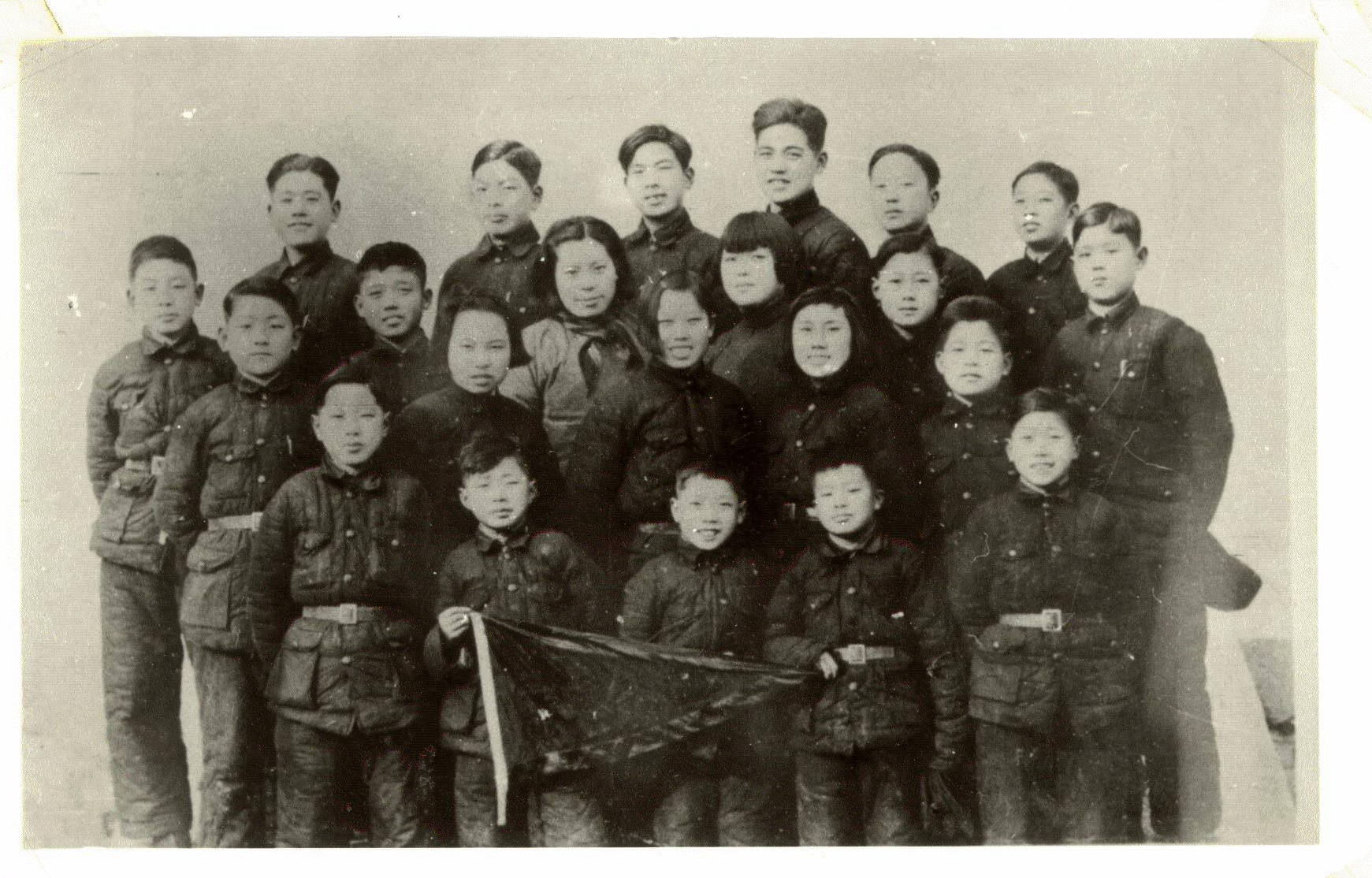 (圖1939年冬 開(kāi)封孩子劇團(tuán)在河南開(kāi)展抗日救亡宣傳活動(dòng),第三排左一為趙東宛校友)